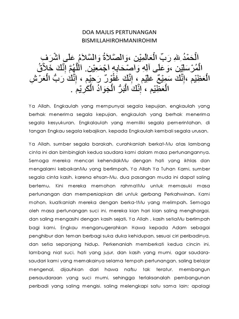 Doa majlis pertunangan الحمد لله رب العالمين حمدا يوافي نعمه ويكافئ مزيده. Ya Robb Ridhoi dan berkahilah pertunangan saudara. Apa-apapun jodohajal dan maut kita serahkan pada Allah SWT.