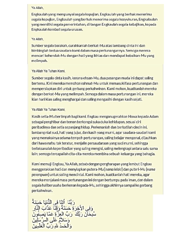 Pertunangan merupakan masa peralihan antara lamaran dengan pernikahan. Kumpulan doa selamat lengkap arab latin dan artinya yang pendek dan panjang meliputi doa selamat dunia dan akhirat ulang tahun di. Ringkas Doa Selamat Majlis Pertunangan Pdf.